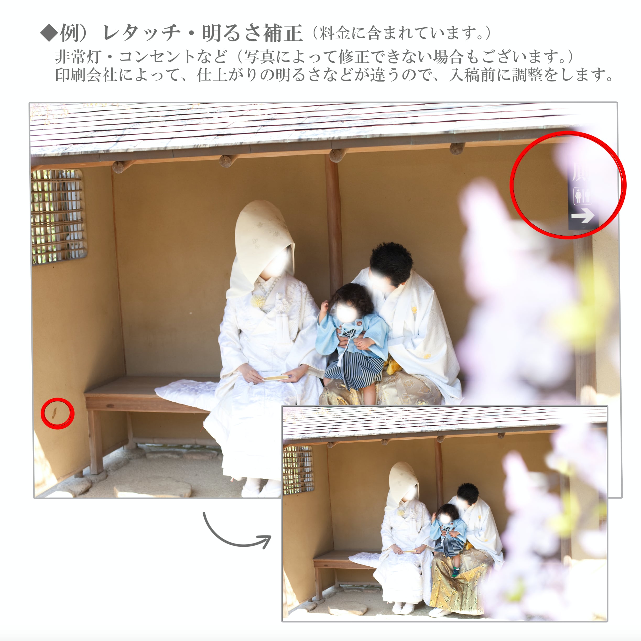 ■【レタッチ・補正】非常灯などは、追加料金なしで消させていただいております。印刷会社に合わせて入稿前の明るさの調整など全て追加料金なしで調整させていただいております。